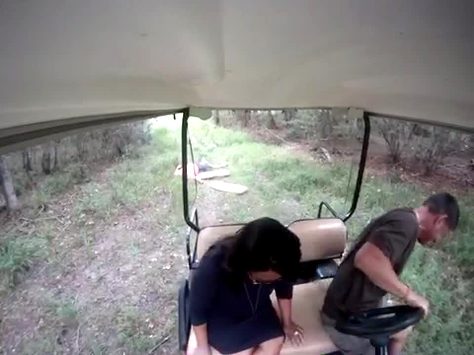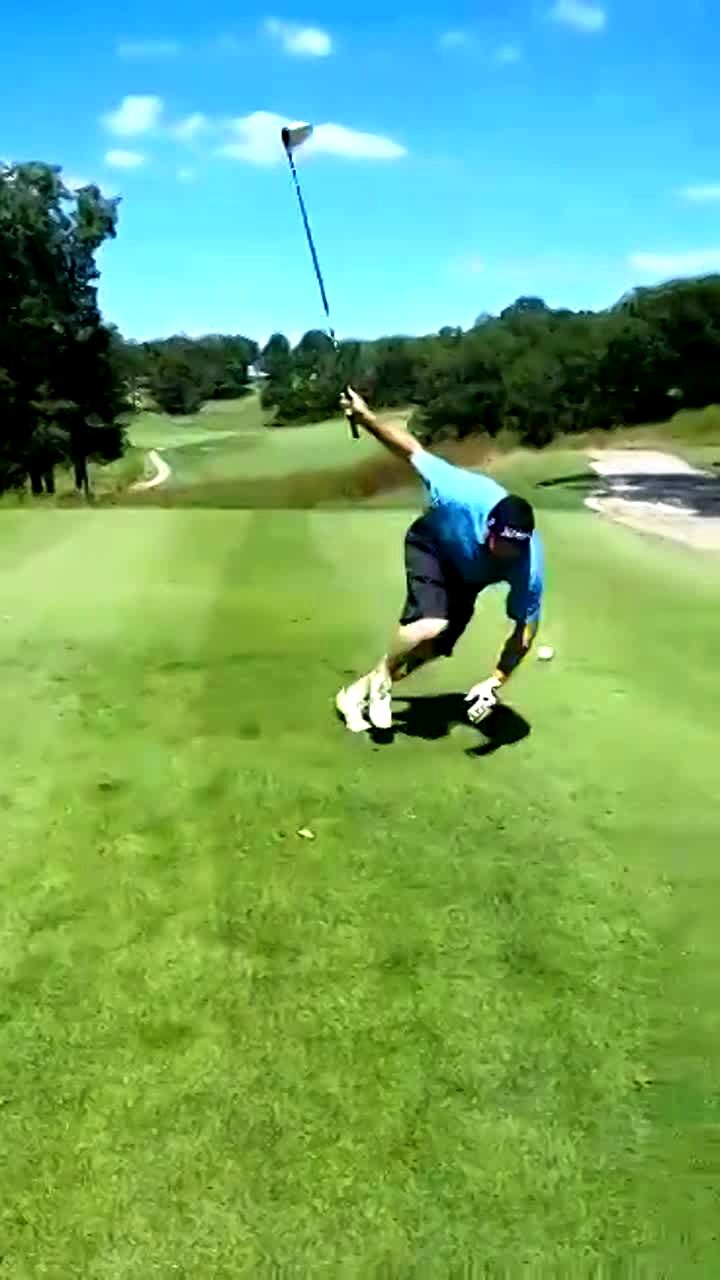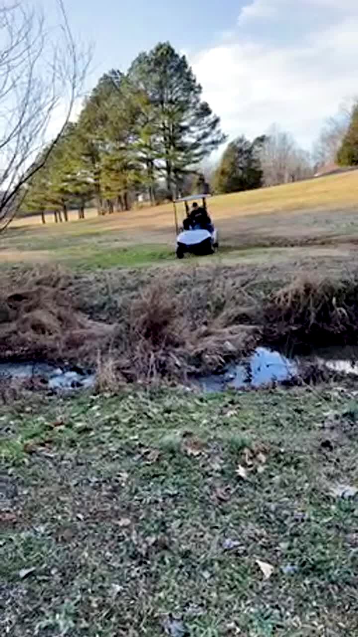 Teen boy drives golf cart over mound on golf course, crashes and falls out of cart. Bonehead.