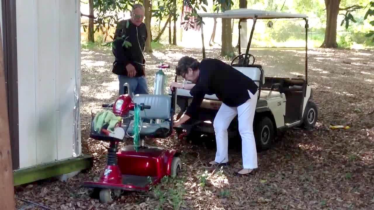 A senior man and senior woman attach a scooter stuck in a pile of leaves to the back of a golf cart. The man drives the golf cart to tow the scooter while the woman rides the scooter and the scooter falls backwards onto the ground.