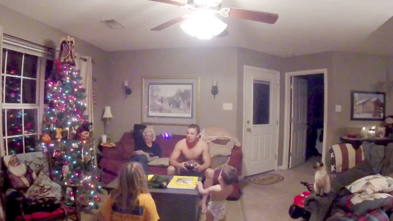 A man calls his dog ugly. The dog whines and knocks the camera down.