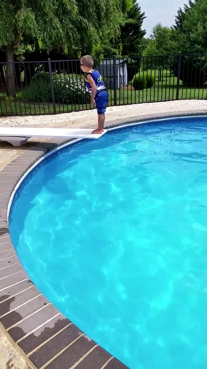 A tot boy rides a tricycle around the floor at home and asks for "horsepower" from his father, who kicks the back of the cycle and pushes him down the hallway. On the third lap the man pushes too hard and knocks the boy over.