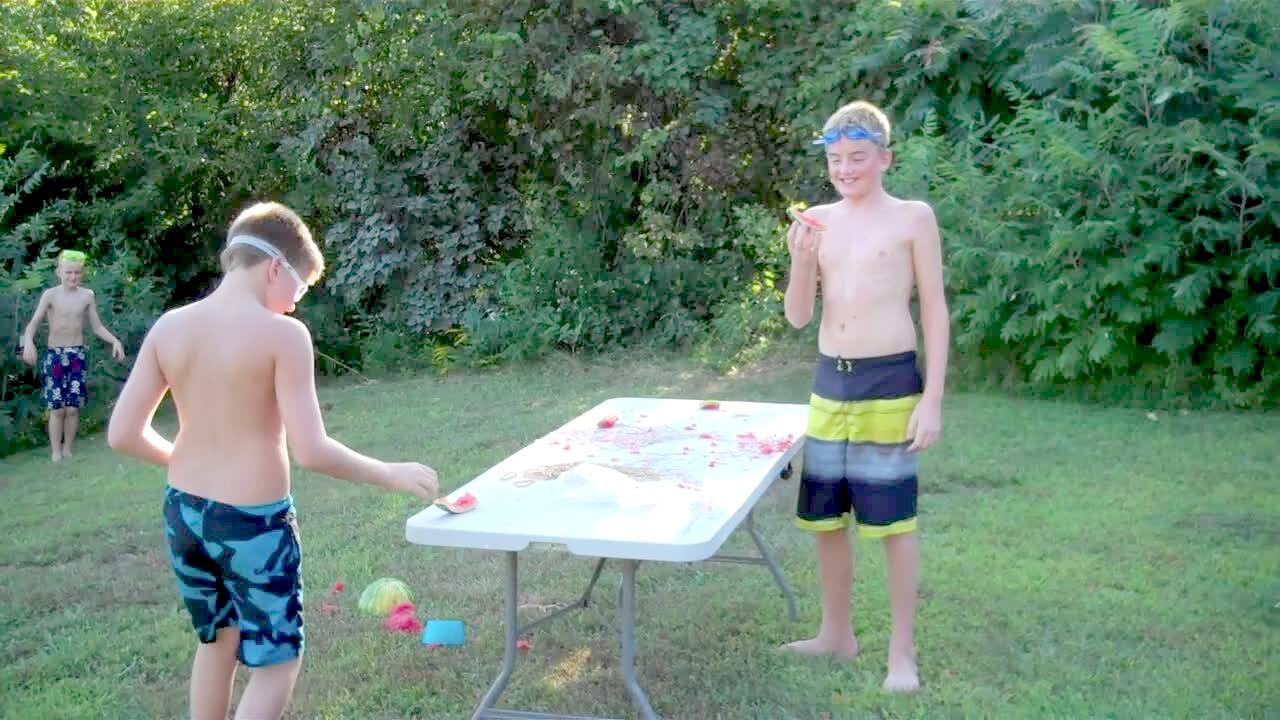 A woman tries to sit down on an inner tube on a dock outdoors and then slide into the lake. The woman rolls over backwards into the water and comes up gagging.