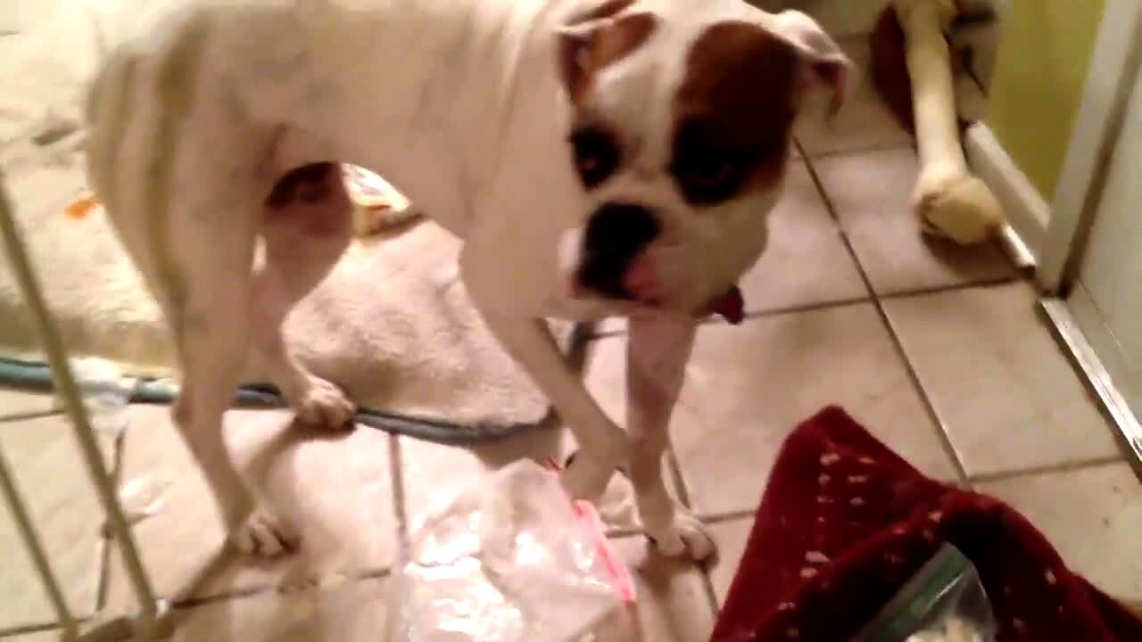 A man asks his boxer dog if she made a mess of the trash in the kitchen and the boxer looks guilty and avoids looking at him.