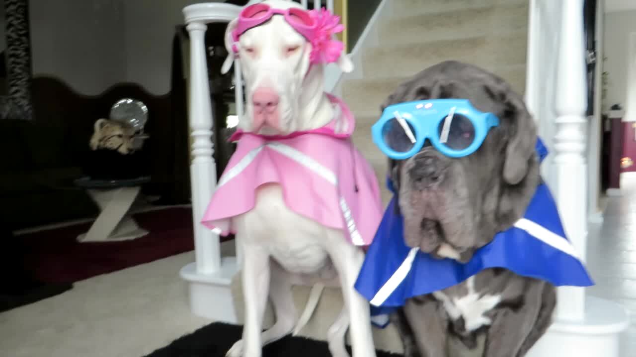 A dog in a pink cape with pink goggles and a wrinkly dog in a blue cape with blue goggles with windshield wipers on wait indoors to go outside in the rain.