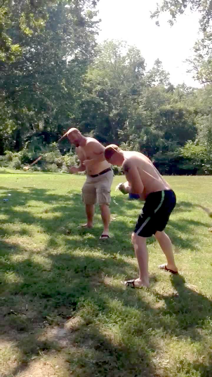 A woman helps a tot boy put mentos into a bottle of diet coke outdoors but when the soda shoots out, it hits the boy in the face and he runs away crying.