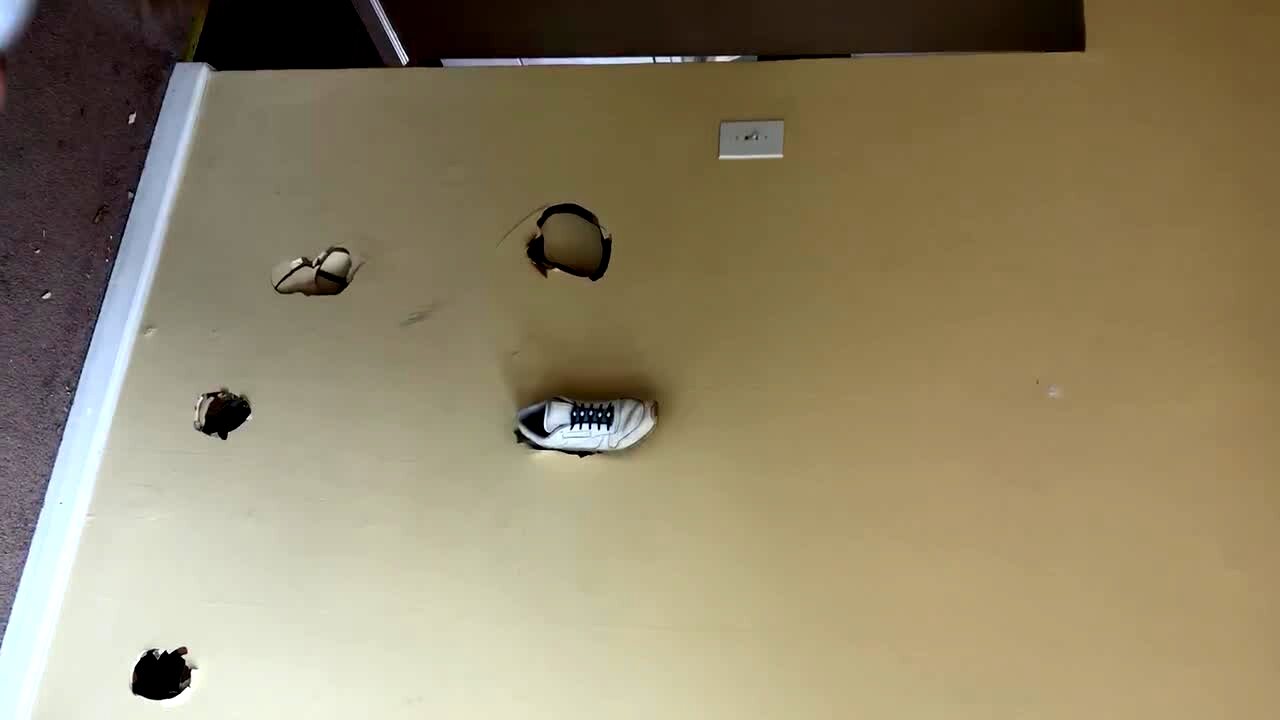 A young boy tosses a football back and forth with his dad in a basement. When he says, "tough guy," the ball bounces back and hits him in the head as he drops to the floor. Security footage.