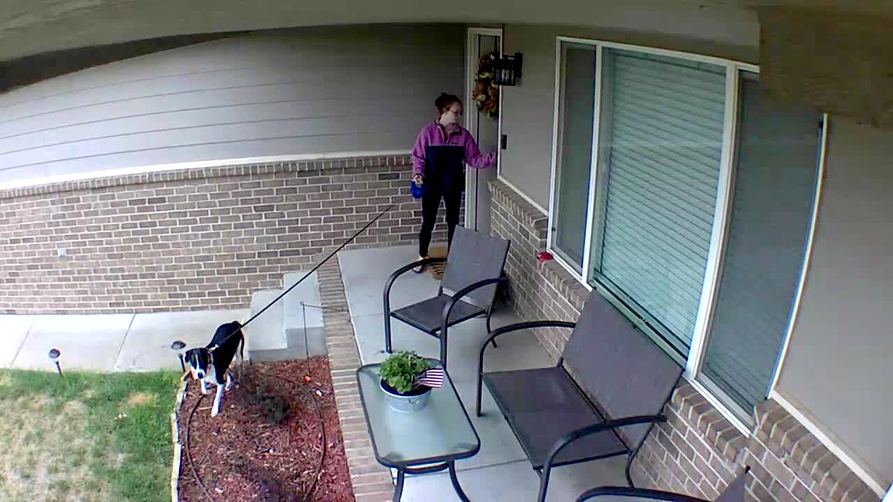 A young boy shoots a basketball and the wind picks up and blows two trash can lids open and the ball blows into one of them in the driveway. Security footage.