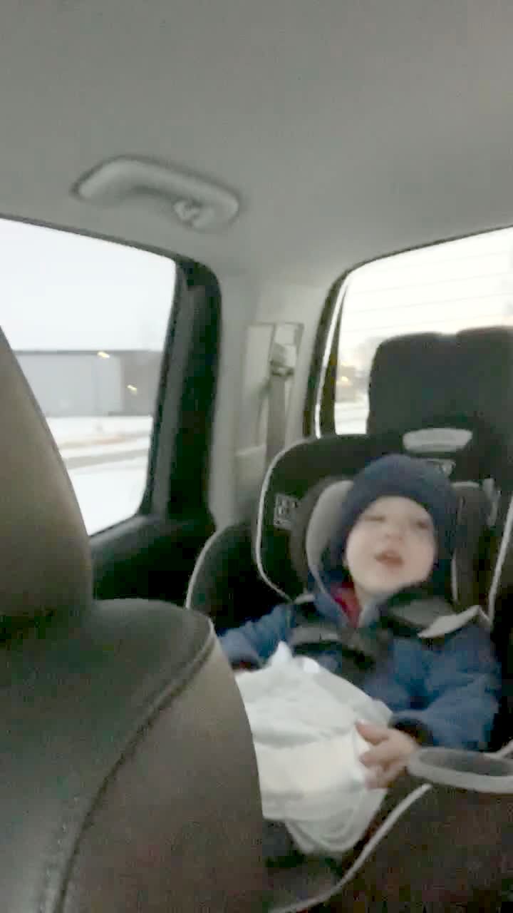 A young boy on his driveway shoots a basketball, misses, and complains that he never makes his shots. He throws the ball backwards over his shoulder and gasps when it goes in.