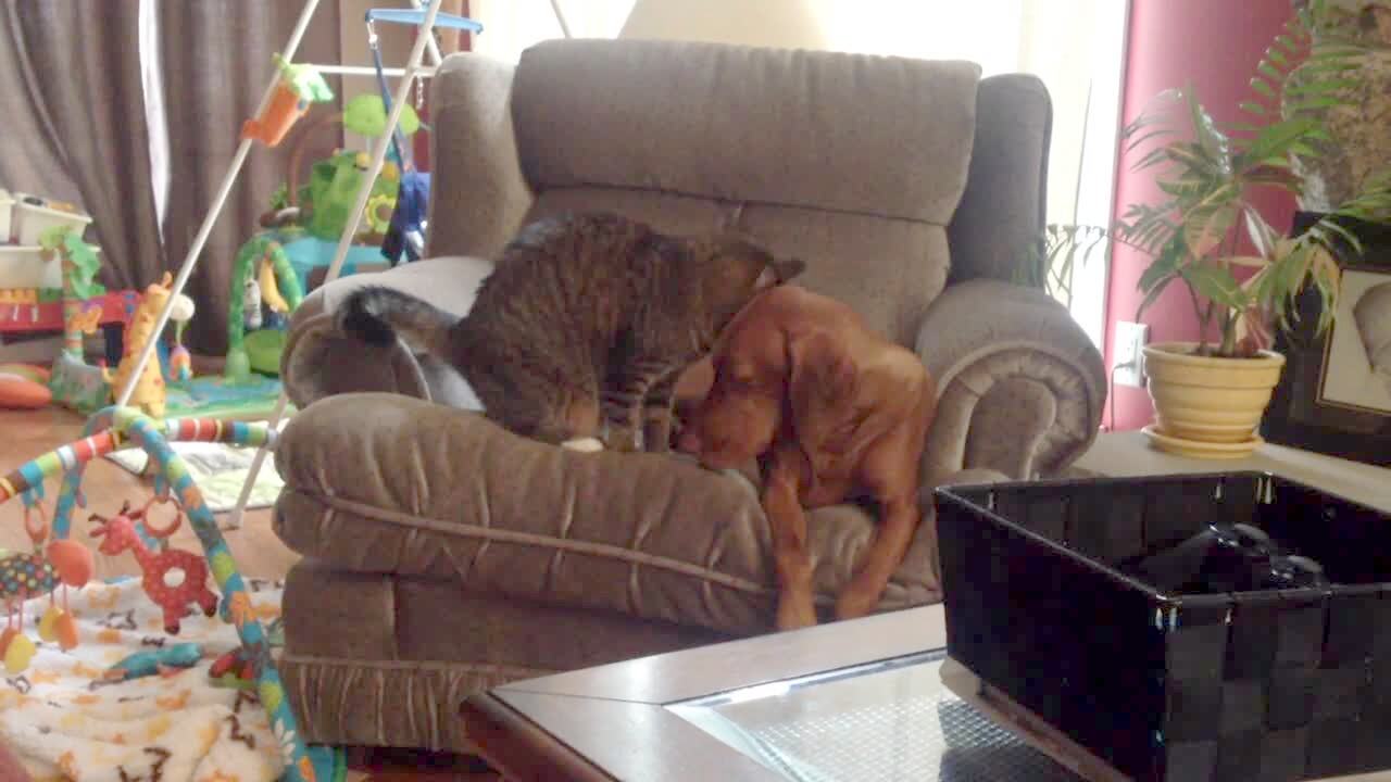 A cat rubs against a dog's head in a chair indoors. They hear something and both perk up.