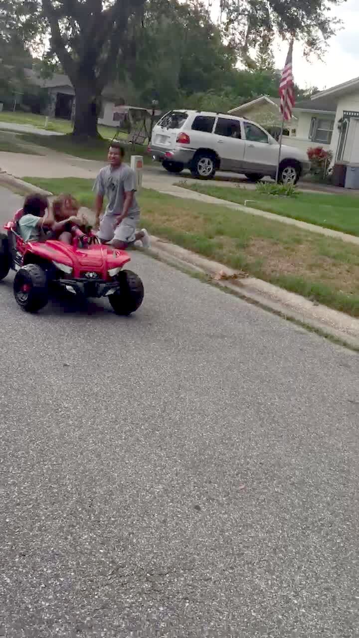 A man runs in front of a kiddie car, jumps on it, and falls backwards outdoors. The tot girls driving the car cry.