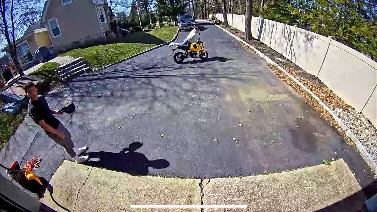 A teen boy attempts to do a wheelie trick on a motorcycle in the driveway of a home, but he loses control and falls through a fence. Security footage.