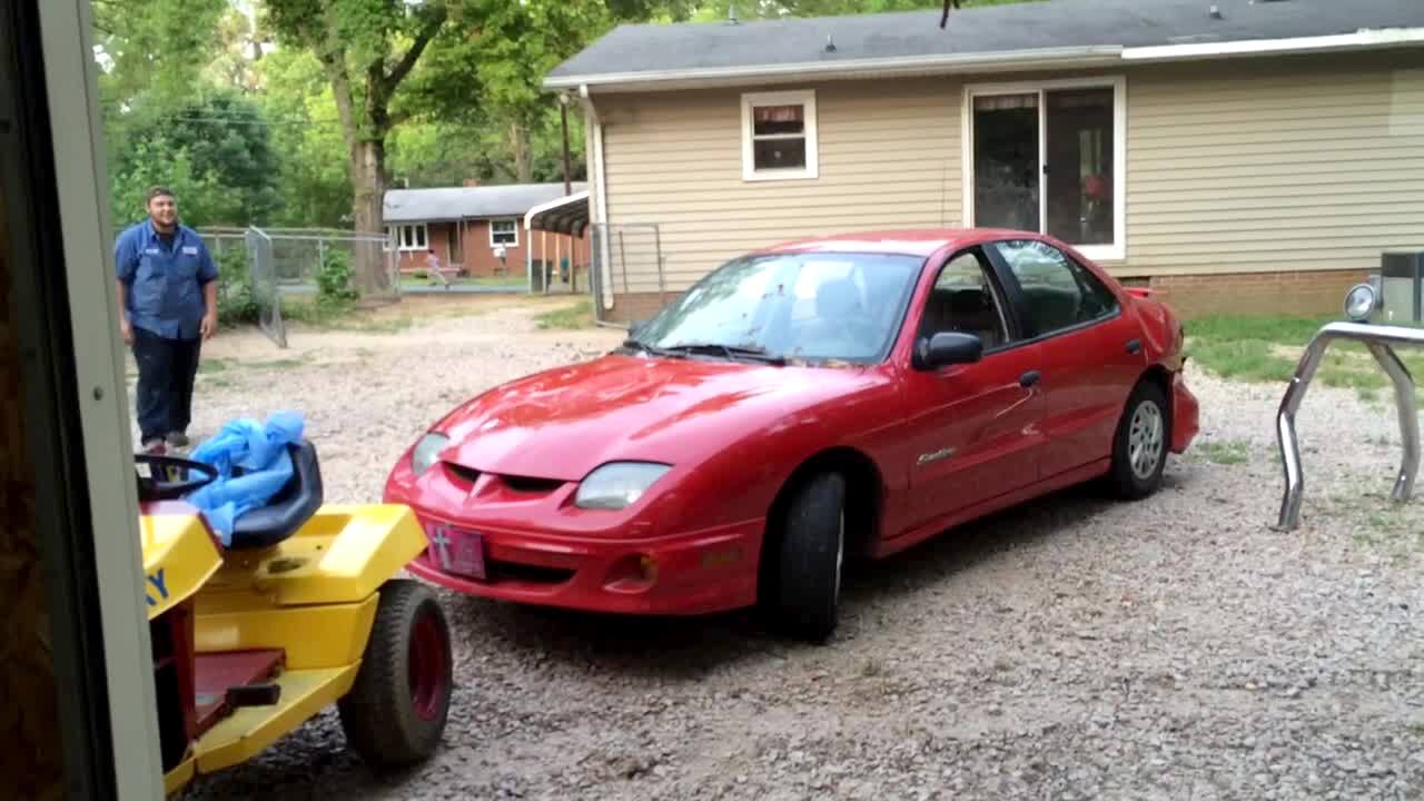 A boy stands on the hood of a power wheels car as his tot sister drives it and he falls off.
