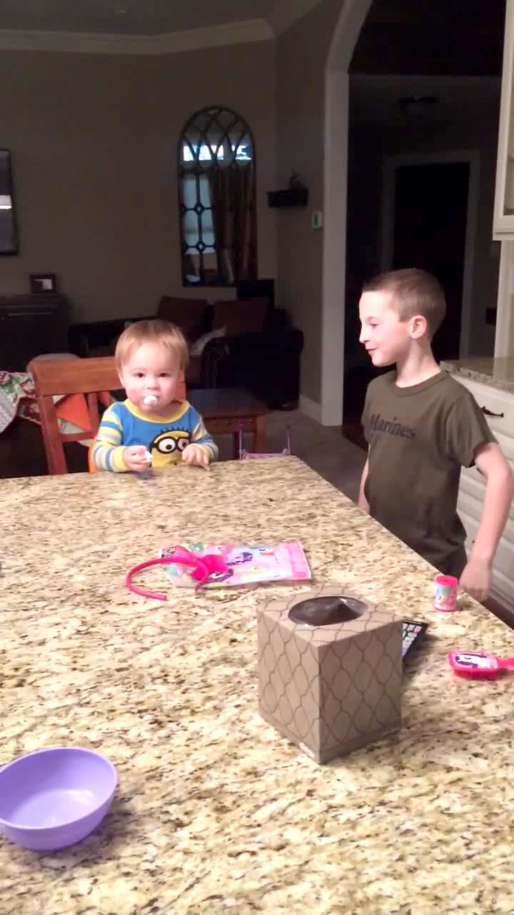 A teen girl and her little brother blow plastic bubbles indoors but the boy blows too hard and a huge string of snot shoots out of his nose. Gross.