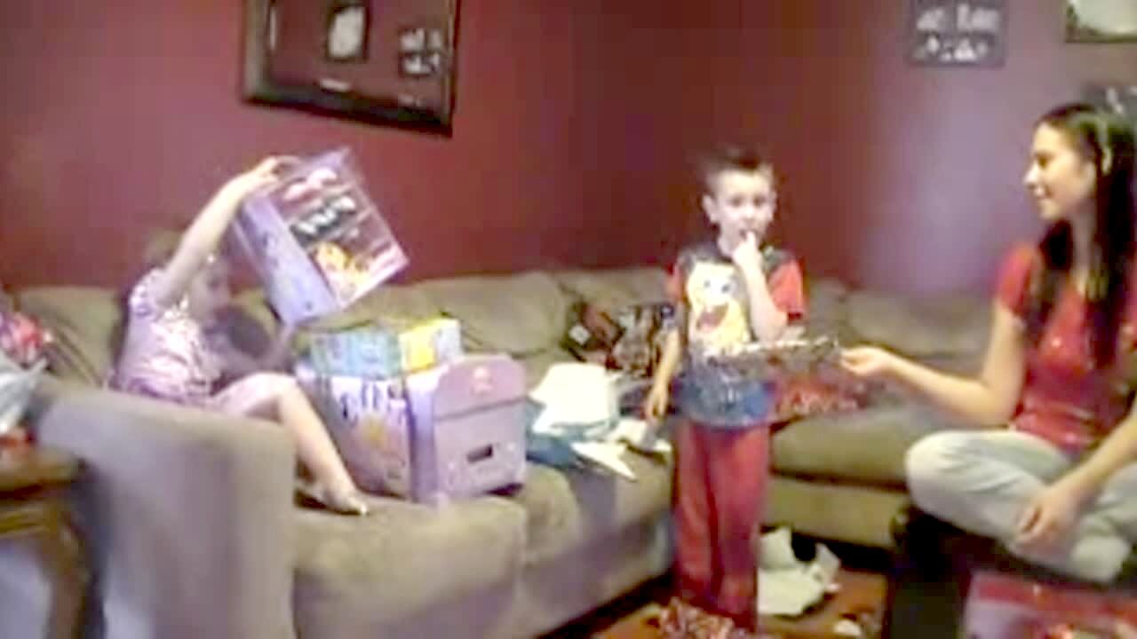 Boy opens a Christmas present & hits himself in the face with it while he's trying to get the ribbon off. He starts crying & holds his nose.
