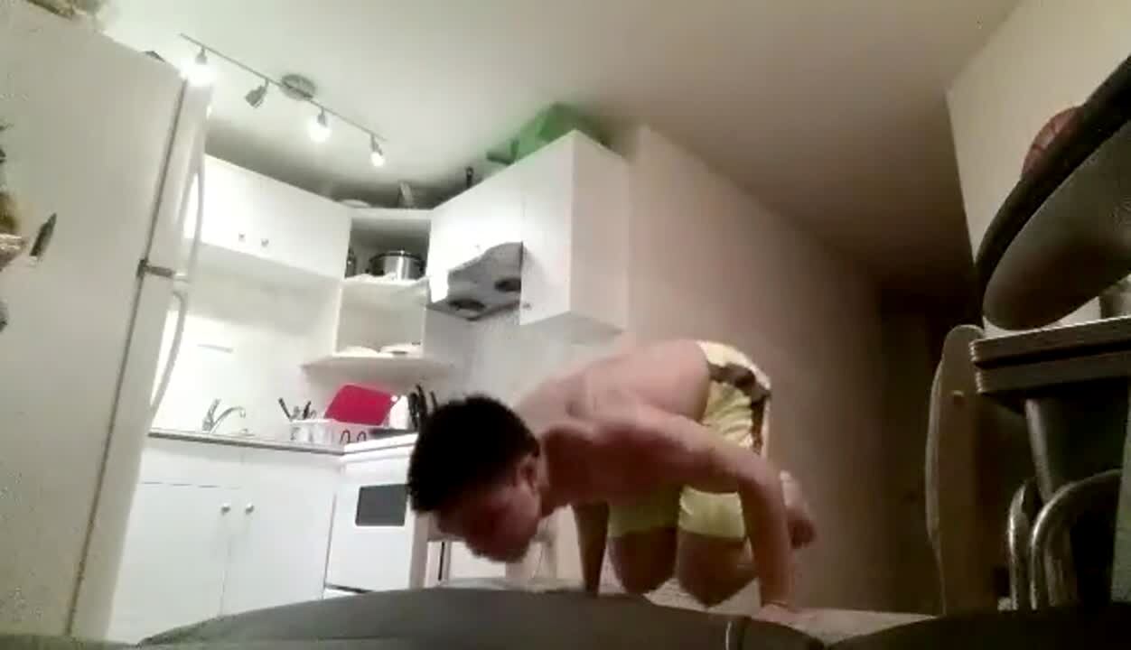 A teen boy holds himself up to balance on a pair of crutches repeatedly indoors before he loses his balance and falls down. Vine/instagram.