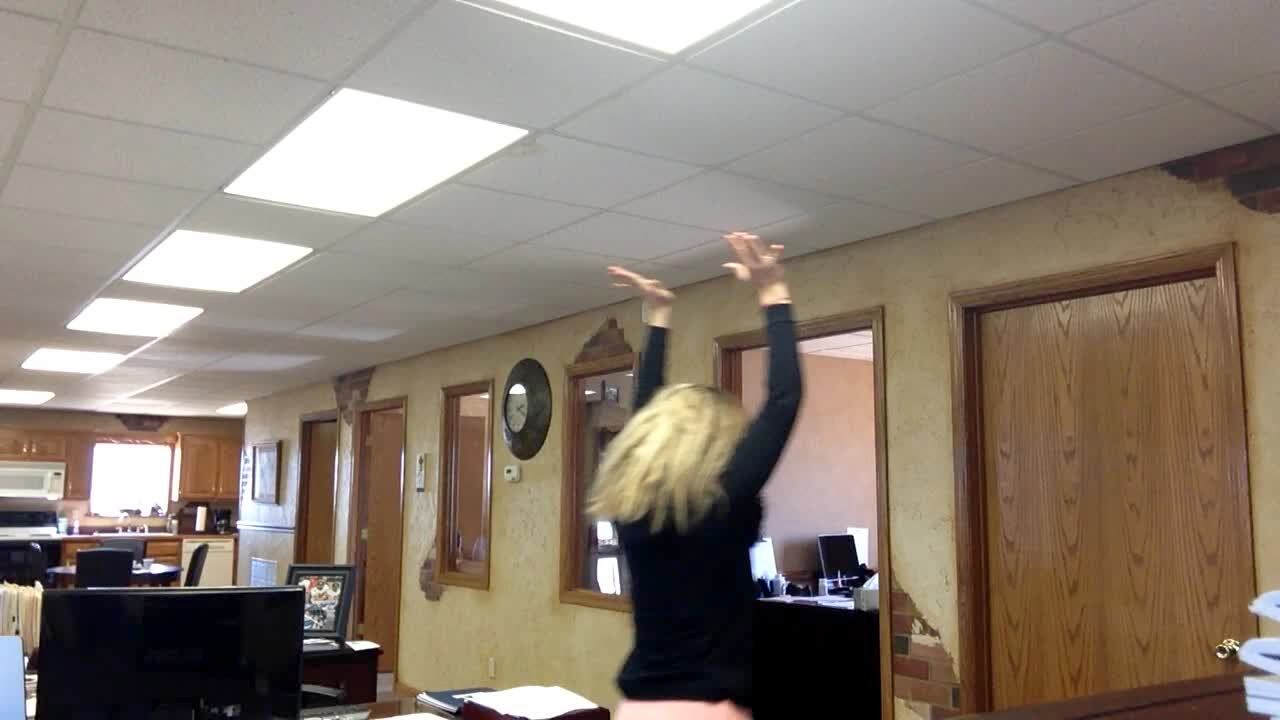 A teen girl sings and dances on a chair indoors when she falls off. Her dad calls from another room and the girl says she's okay.