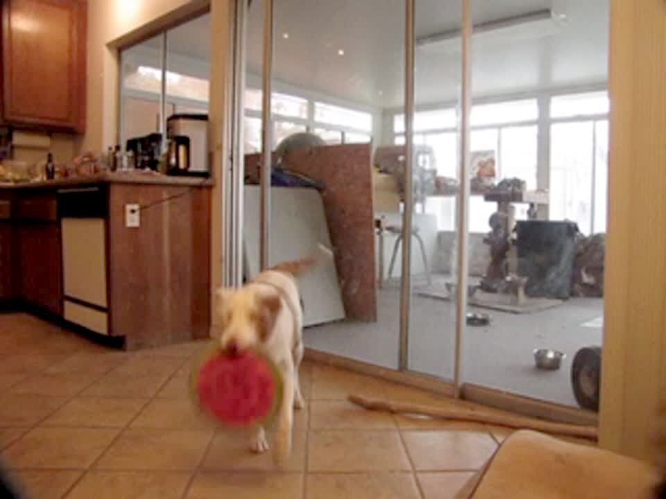 A dog barks over a tennis ball stuck under his food bowl, and a man reveals there are dozens of tennis balls all over the floor.
