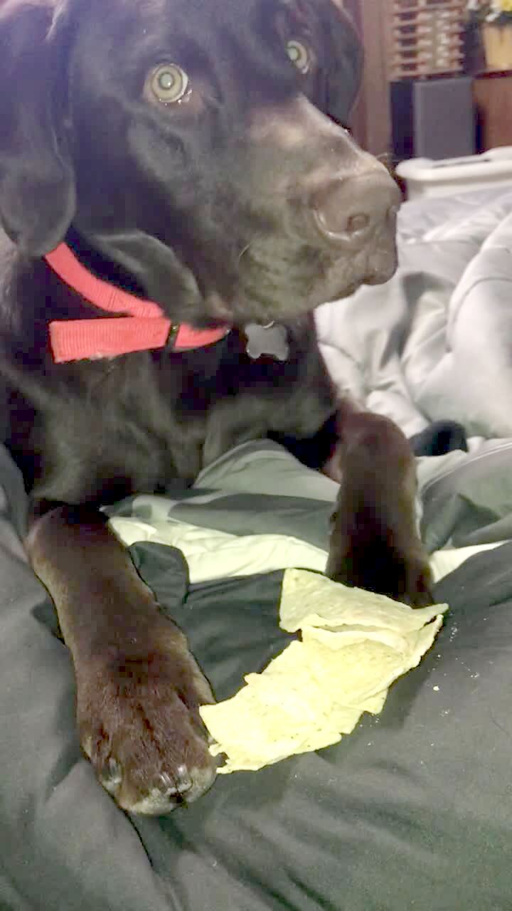 A dog sleeps with tortilla chips being stacked on his nose. A man wakes the dog up and the dog looks surprised and eats the chips.