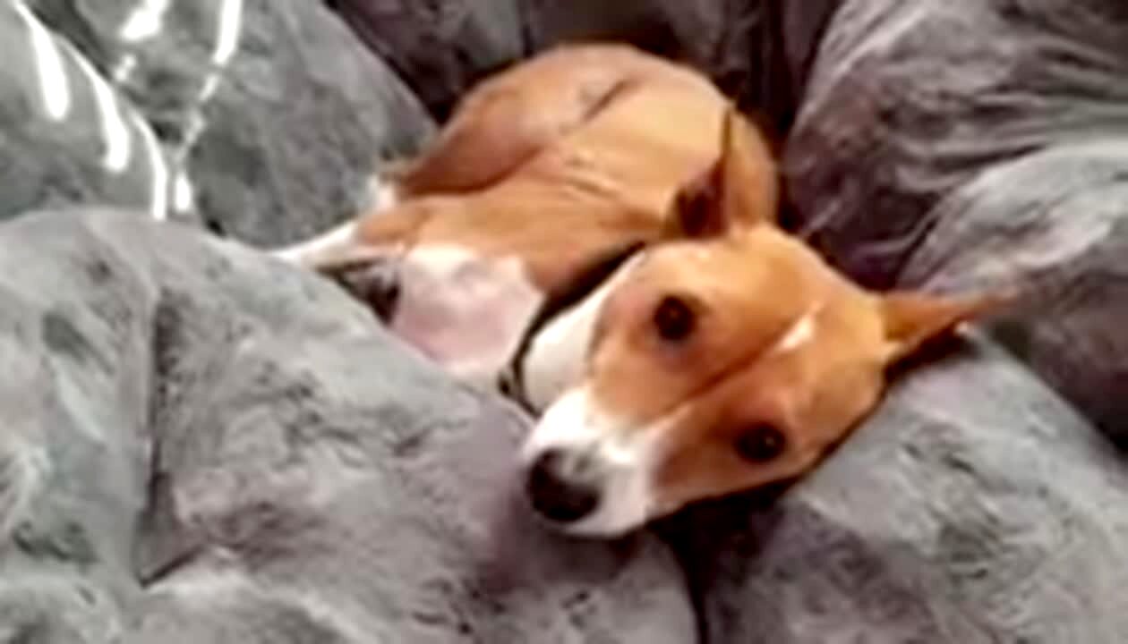 A Corgi dog sleeps on its back on a bed and rolls off of the bed.