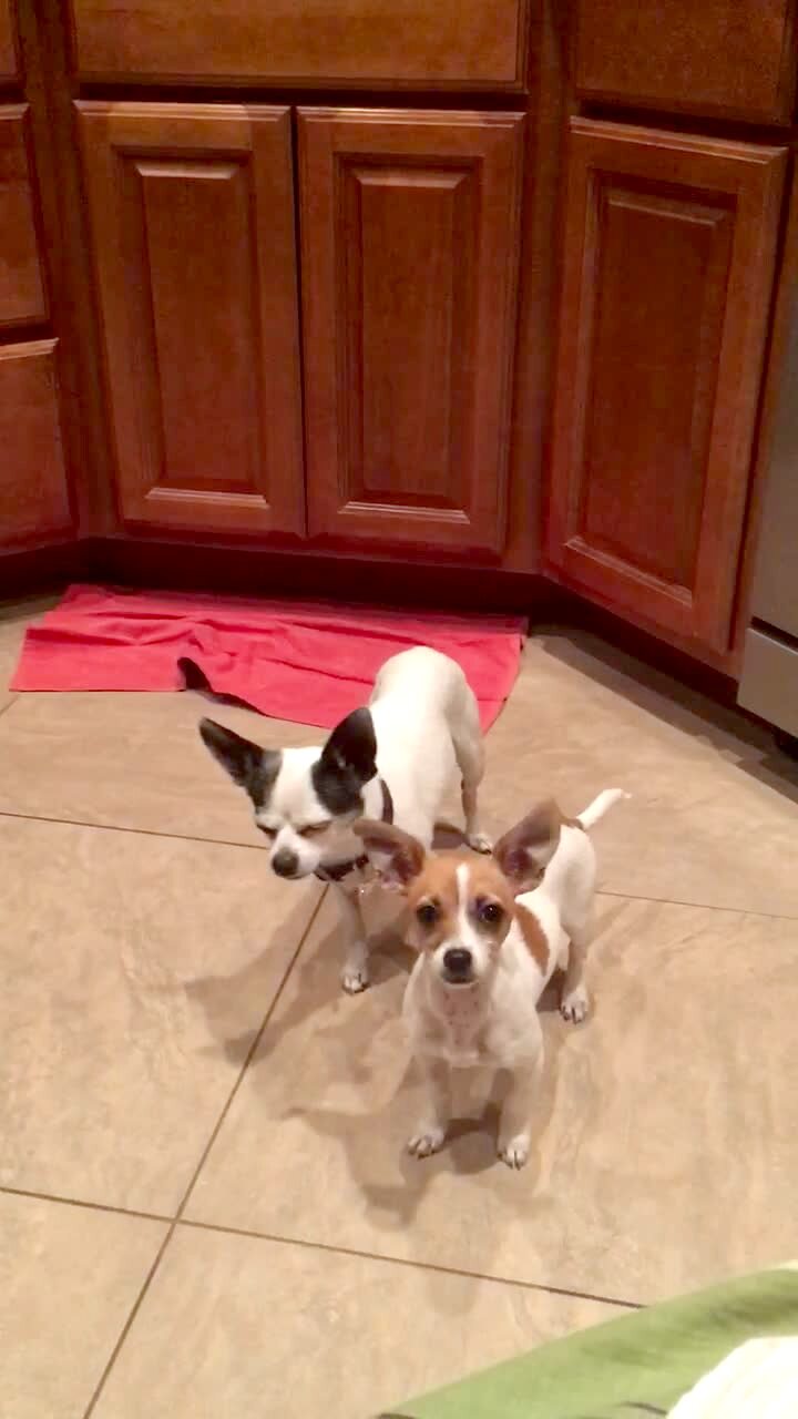 A small dog growls in a chair when a man tells it to get up repeatedly indoors.