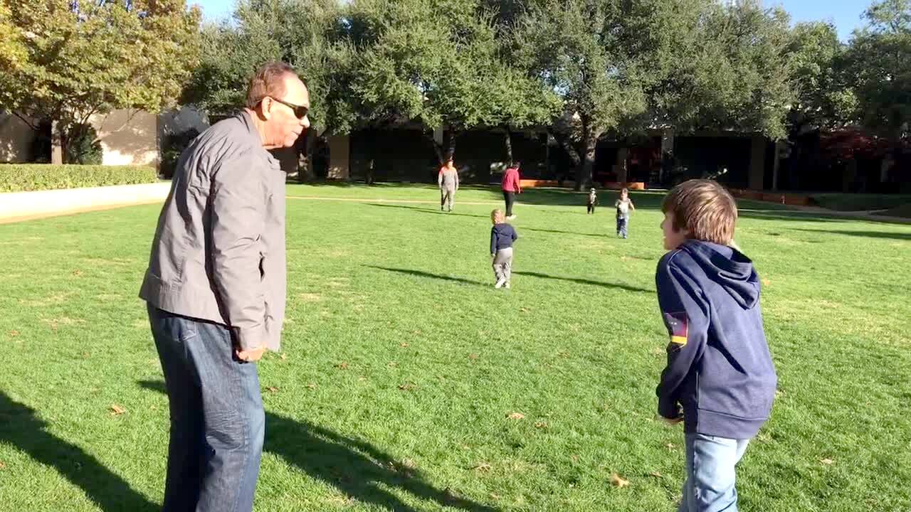A senior man in his driveway holds a tetherball by the rope while a young boy and a young girl hit it. They accidentally hit the ball into grandpa's groin.