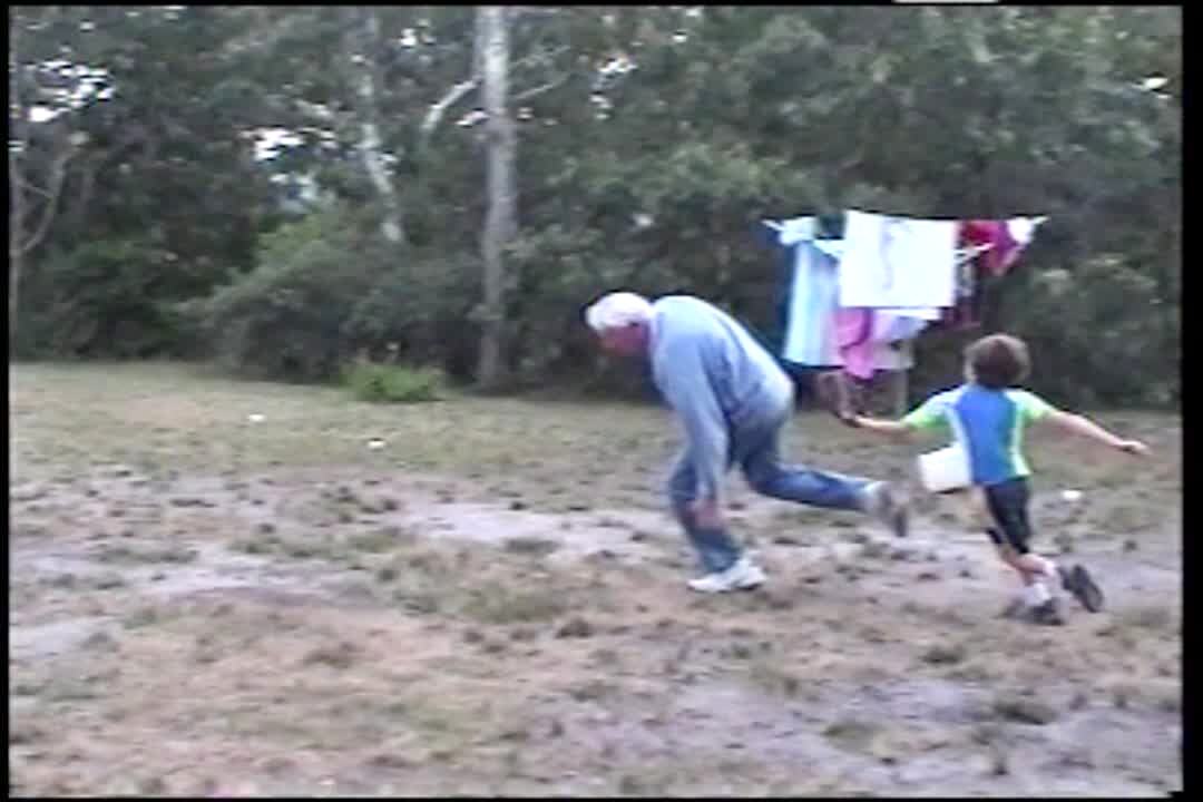 *This video has a second angle with clip #715228* In security camera footage, a senior man runs around a driveway as a young boy chases him in a game of Duck-Duck-Goose before he trips and falls into a bush. Two women help pull him out of the bush and they resume playing the game. No sound.