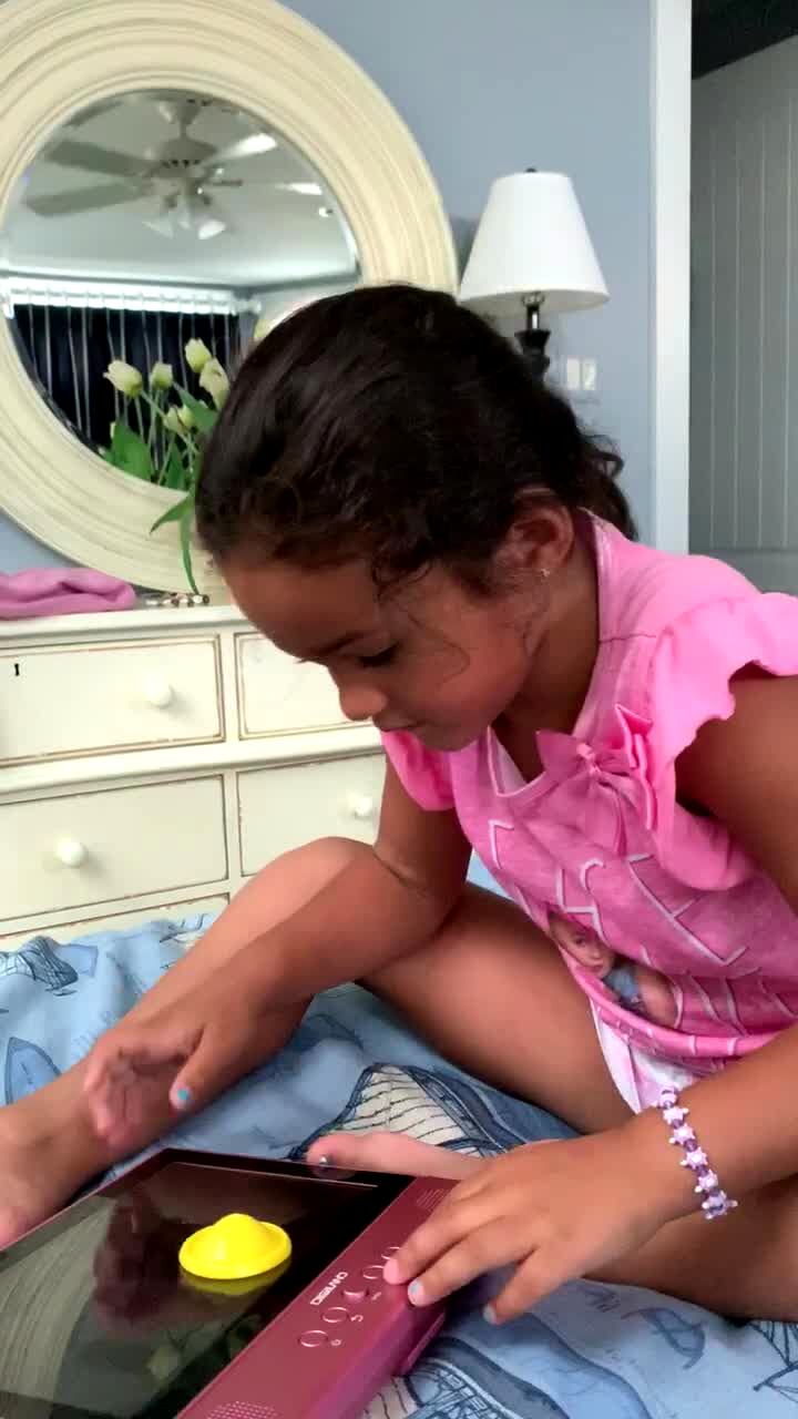 A boy rolls backwards down a small slide indoors while his tot sister laughs and walks up the ladder to push him before he falls down and she falls off the ladder.