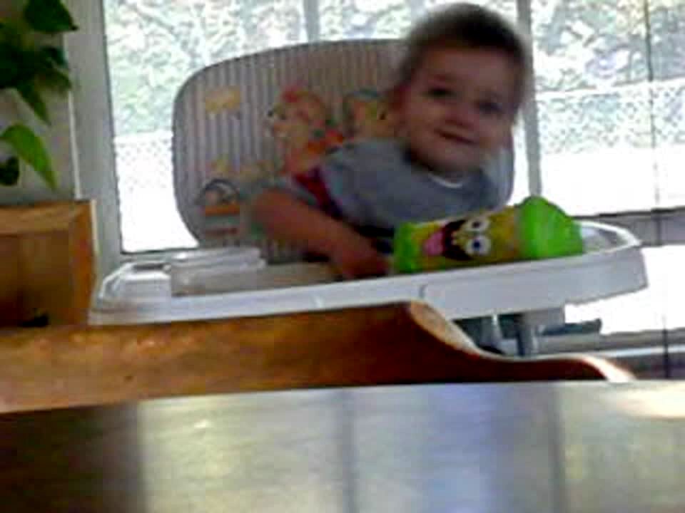 AA: Funny Laughs: Baby boy in high chair laughs funny; almost sounds like he's baa-ing