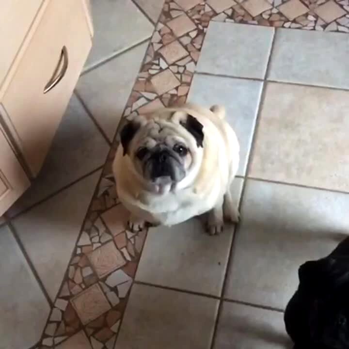 A treat bounces off a dog's mouth in slow motion, it looks around for it on the floor, then another dog takes it and runs out of the room.