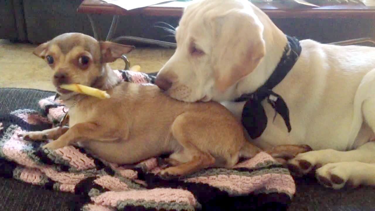 "Tiny Treat Tease" A chihuahua dog holds a treat in his mouth and turns to face a yellow lab dog indoors but each time the lab bites at the treat, the chihuahua pulls it away.