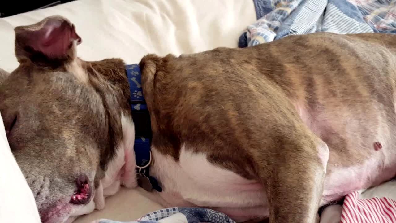 A pitbull mix dog growls and twitches in her sleep indoors.