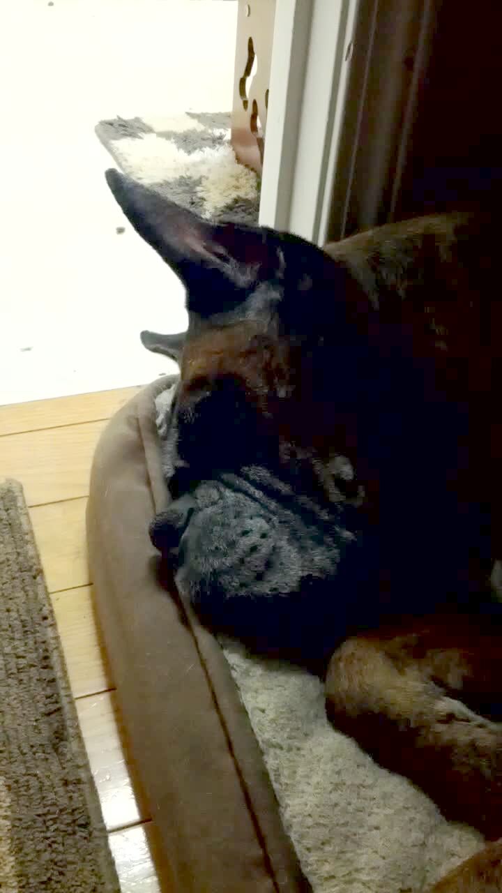 A Mastiff dog snores loudly in its sleep at home. What's that sound.