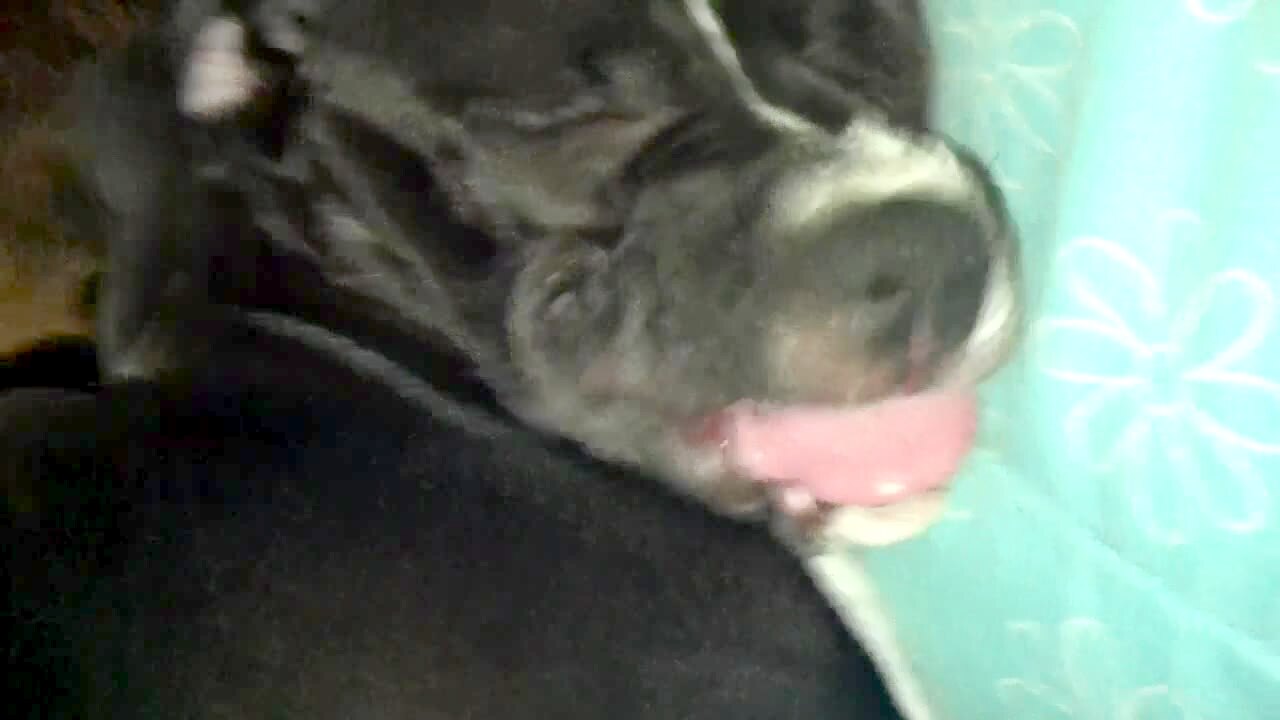 Bulldog rests its head on a chair and makes noises while sleeping. Graphics at beginning of clip.