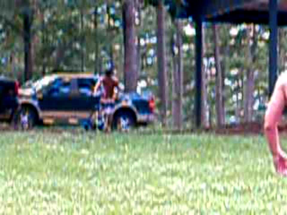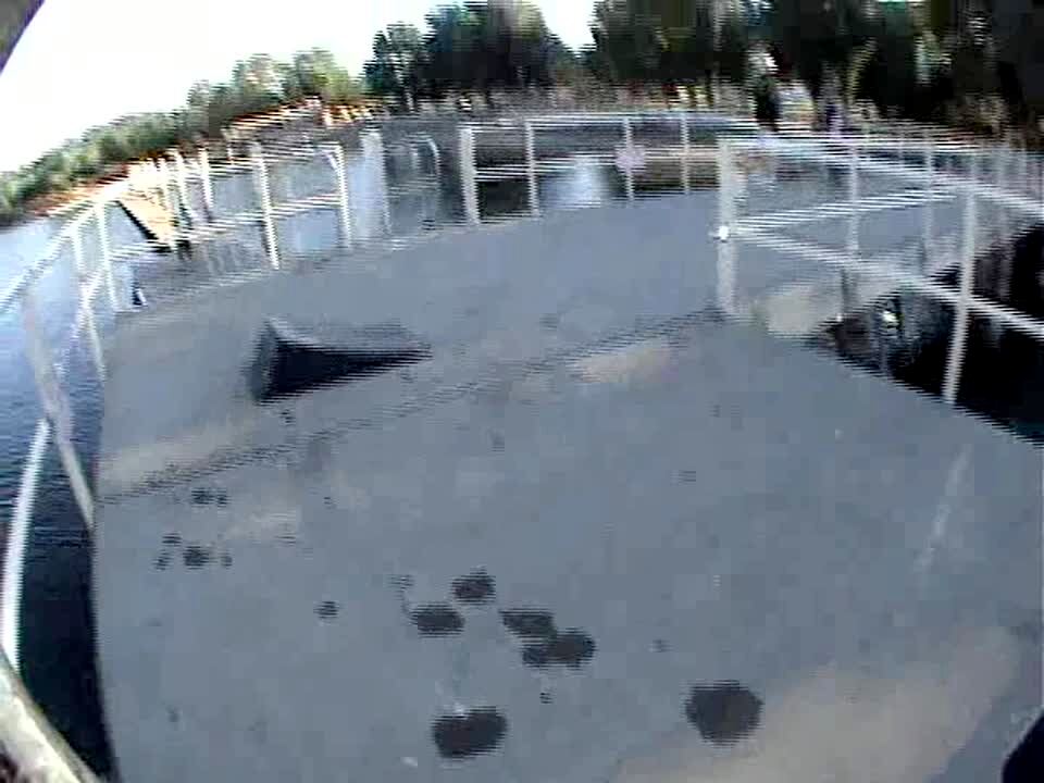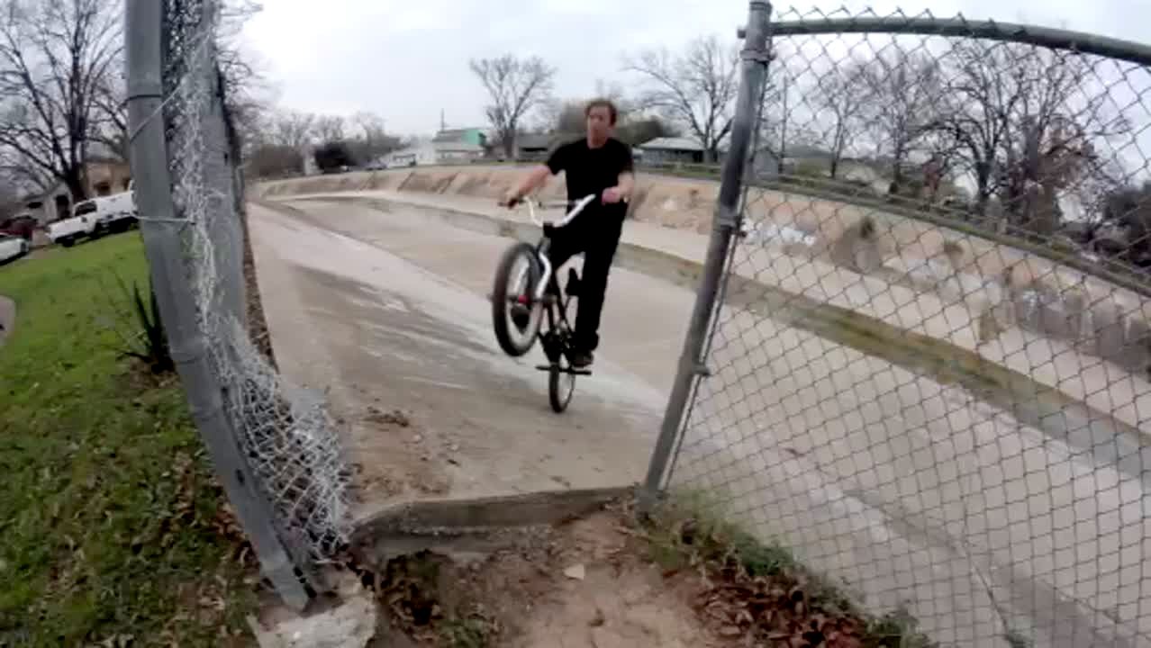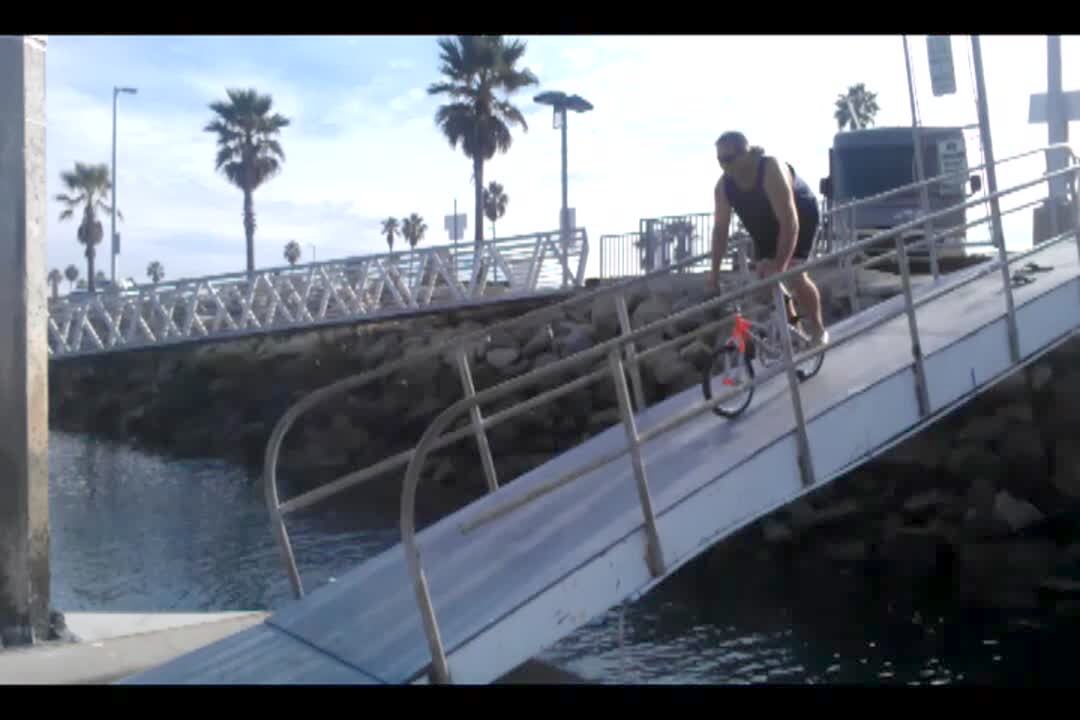Man rides a child's bike downhill, crashes into a bike ramp and rolls into the lake. NO TAIL. Bonehead.