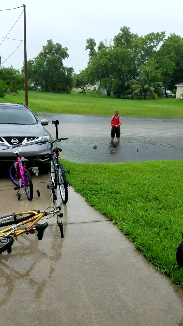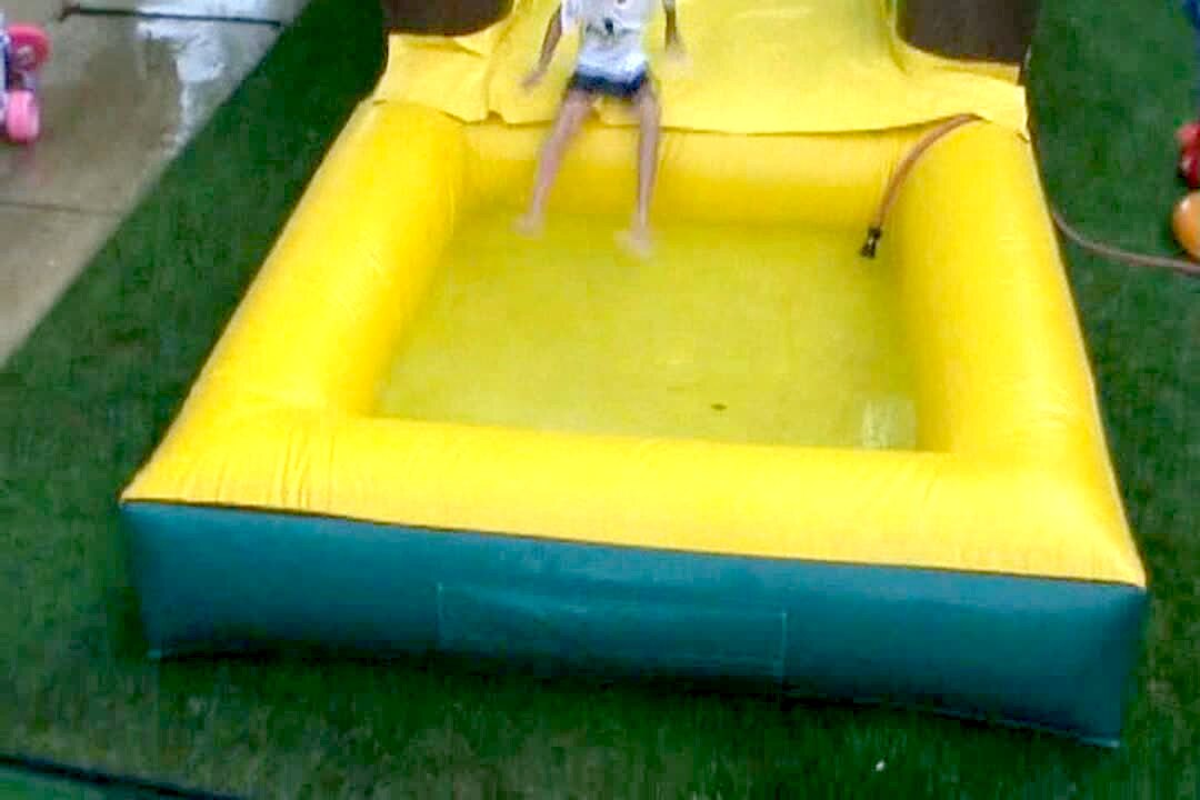 A young boy rides a bike across the backyard onto a ramp that goes into a lake, but he doesn't get enough speed and face plants into the water. The footage then reverses and replays in slow motion.