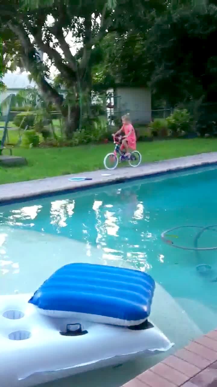 A young girl rides her bicycle around the edge of the pool but then loses control and falls in.