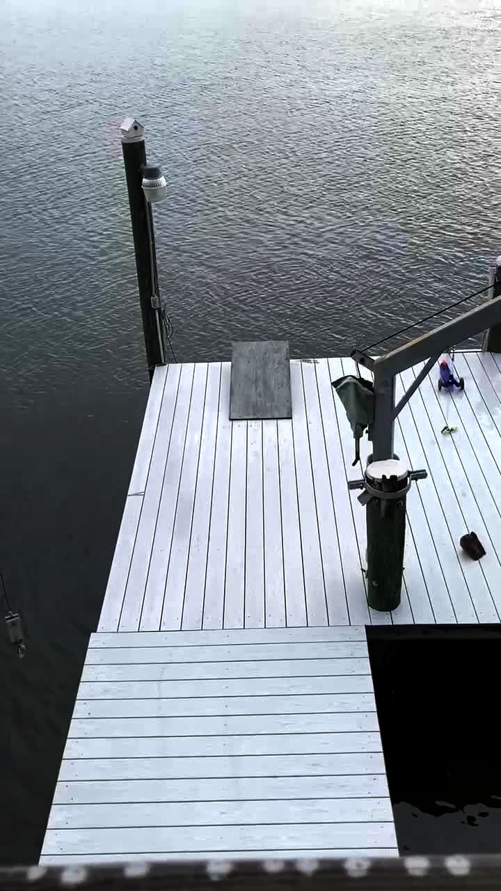 A man rides a bike down a ramp towards the water and slips, hitting his head on the dock.