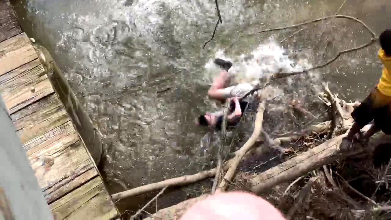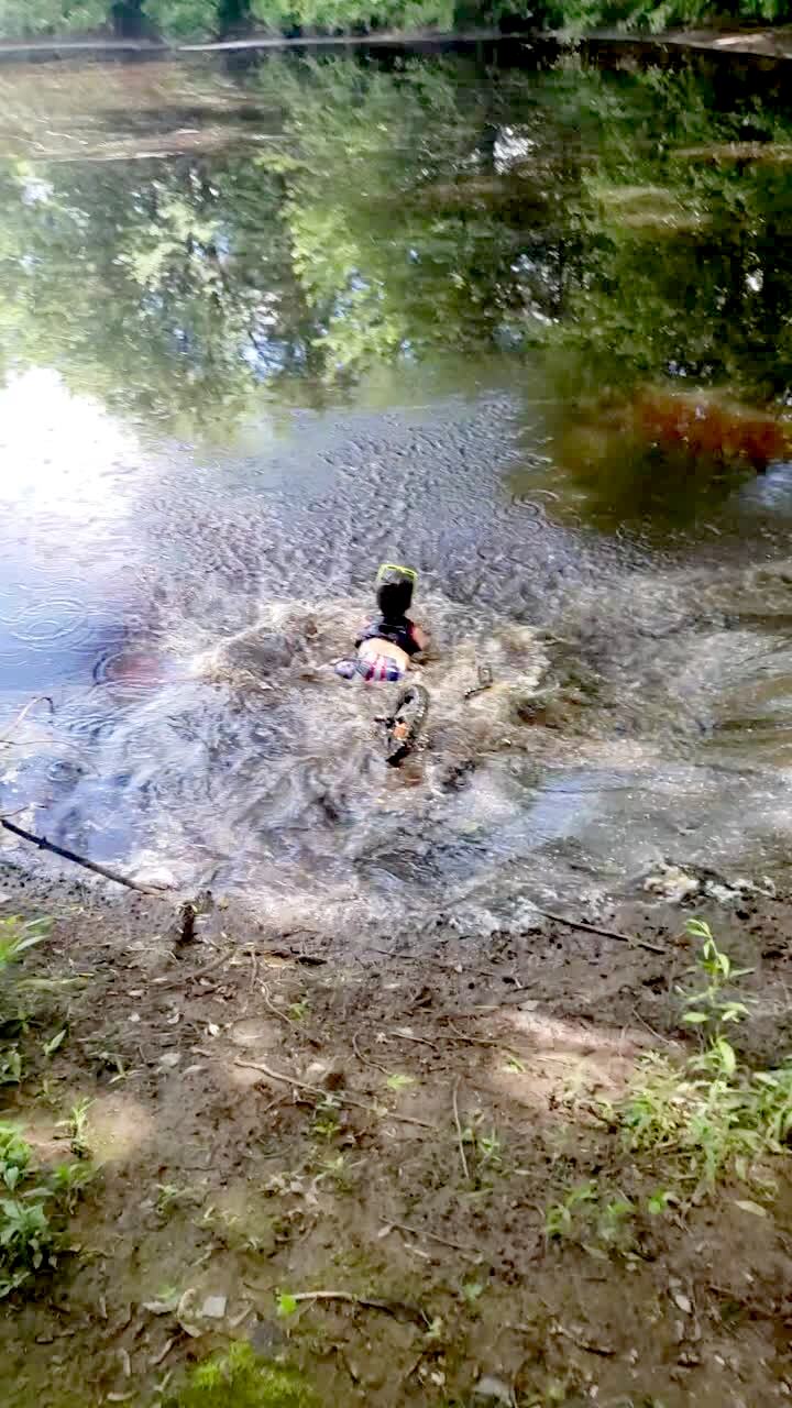 Teen boy rides bike off ramp on dirt trail/road into pond, flies off bike and screams.