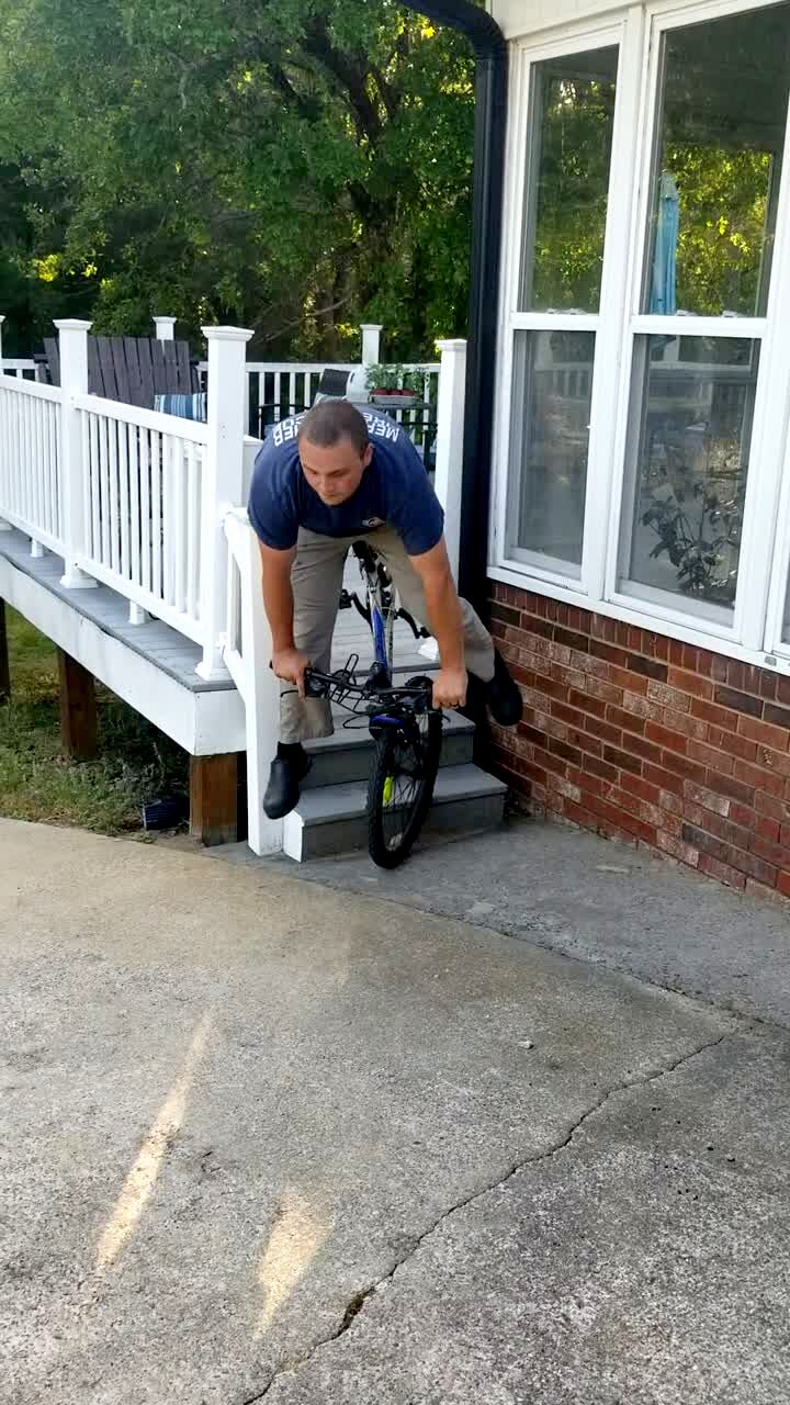 A man falls off a bicycle when he tries to ride it slowly down the porch steps.