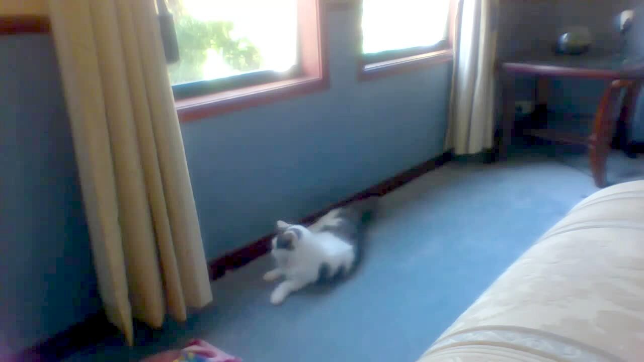 A cat sleeps on a window sill. It falls down and lands in the same position that it was in on the sill.