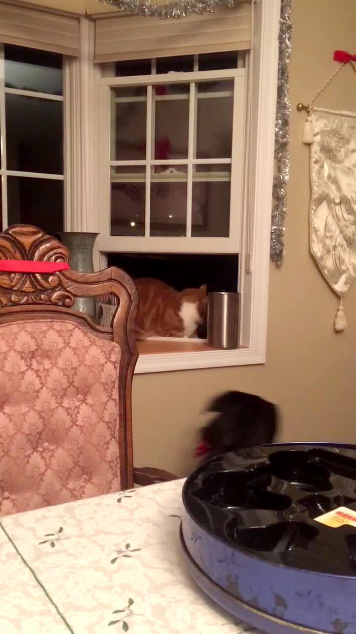 A cat sits in the window sill in the living room indoors and paws at a dog when it barks at it. The screen on the window somehow breaks off and the cat loses its balance and falls out the window.