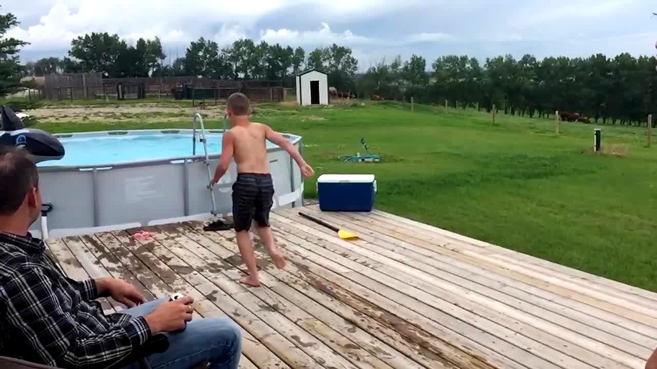 Boy runs from a goose who's chasing after him to attack. Mom tapes and laughs really hard. Geese, birds.