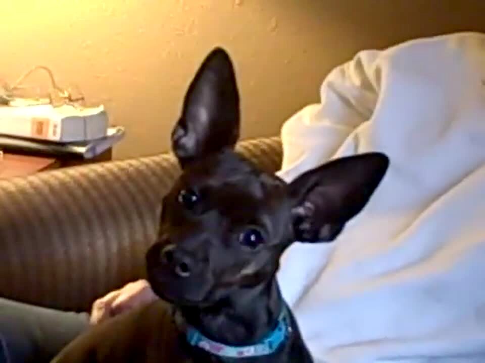 Woman has Chihuahua dog on her lap. Dog tilts its head from side to side as man talks to her.