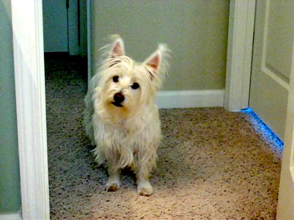 Westie dog tilts her head from side to side when woman asks if she wants to go camping or play ball. Hallway.