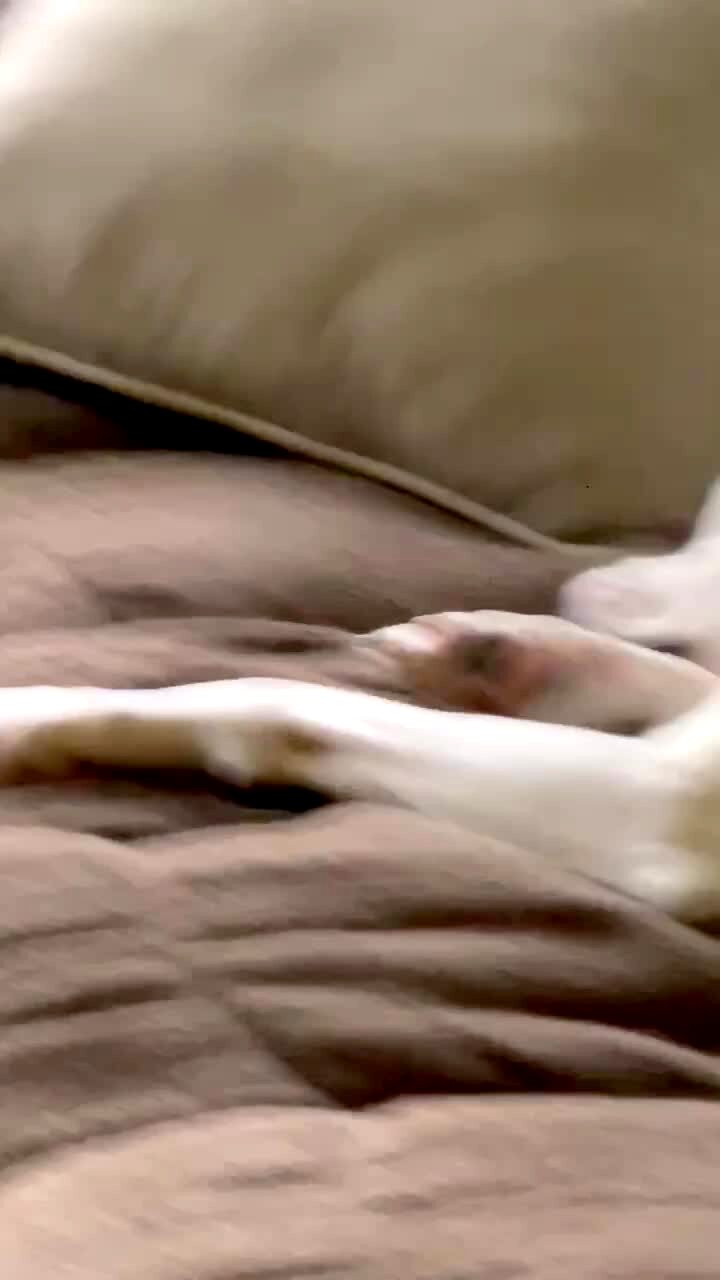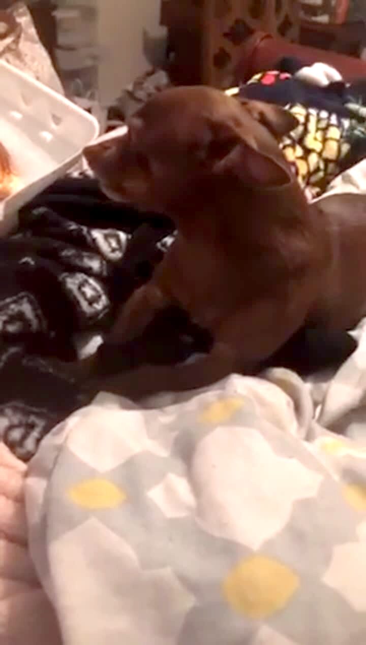 Cute puppy dog is sitting on bed. Shooter says "say something," and the puppy whines.