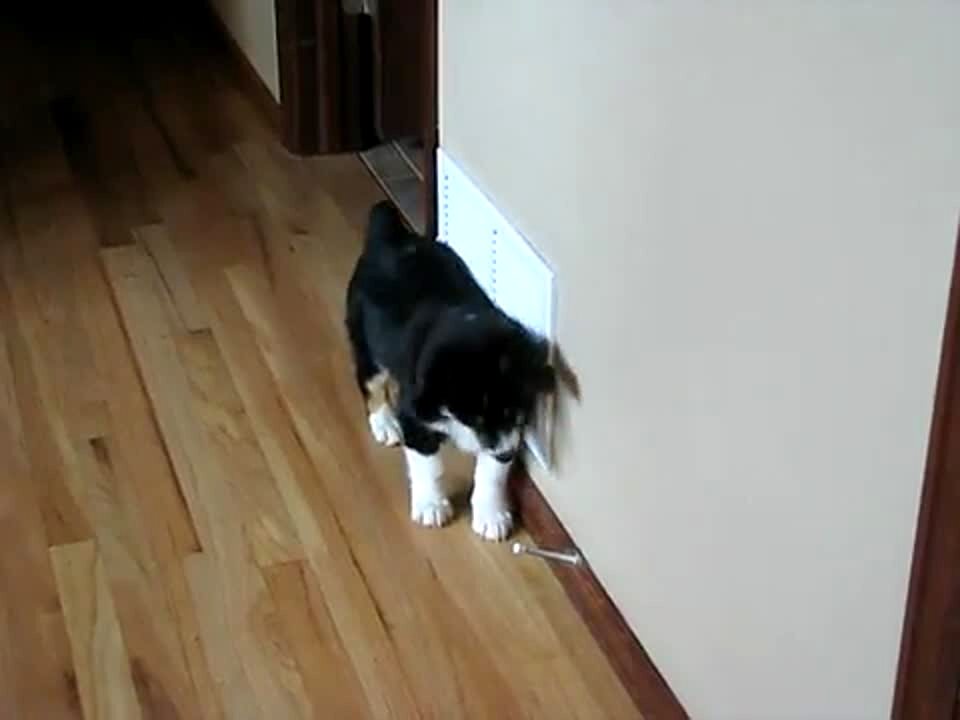 Puppy dog paws at a door stopper and bites, barks at it.