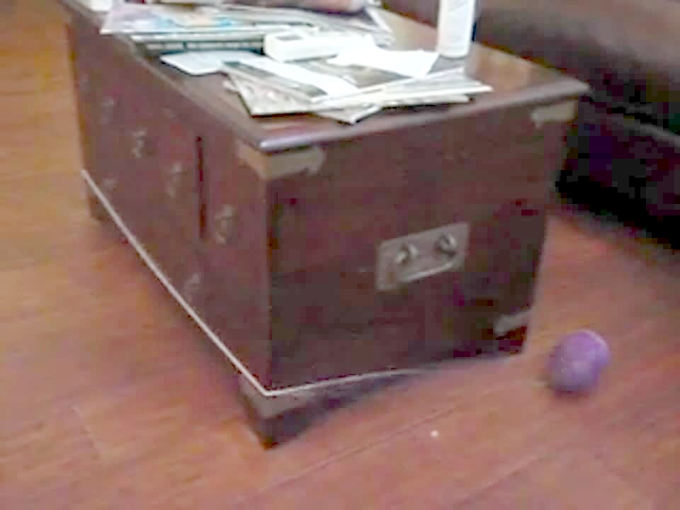 Bulldog chases a yo-yo in circles around a coffee table. The yoyo is attached by string to the dog's leg.