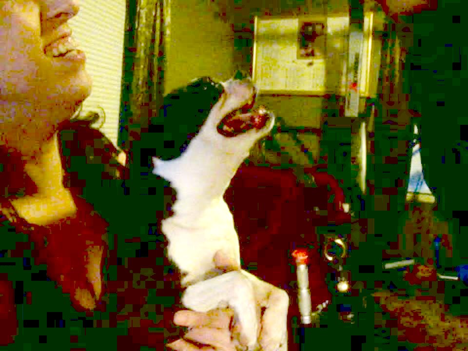 Man holds Chihuahua & woman behind camera says the dog has such a cute face. Then a hand comes from the right side & dog growls & bites at it. Short tail.