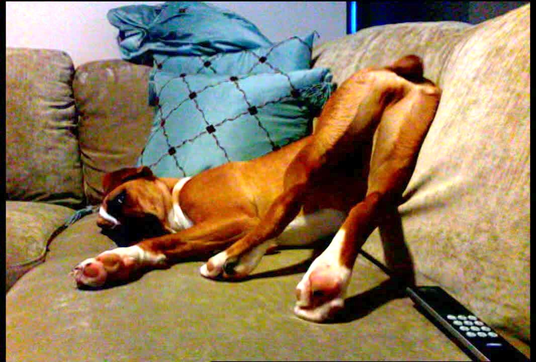 Boxer dog sleeps on couch and holds its butt in the air. Shakes / wags its stubby tail