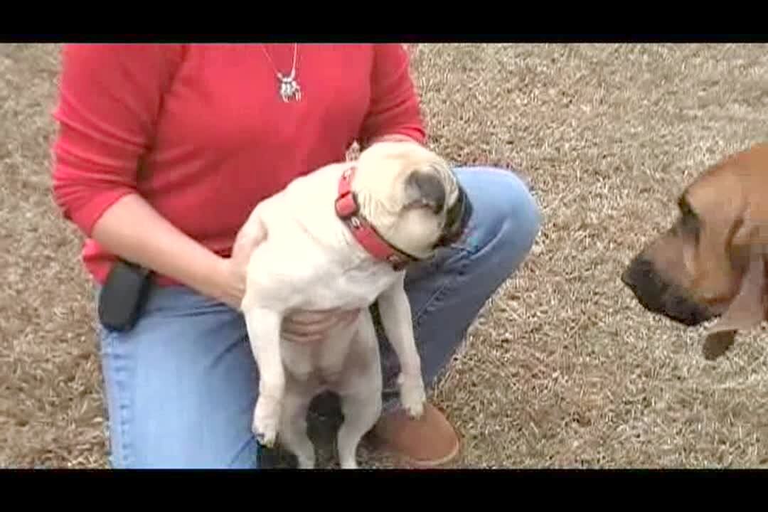 Pug dog makes strange noise while woman holds him in a field. Long for edit.