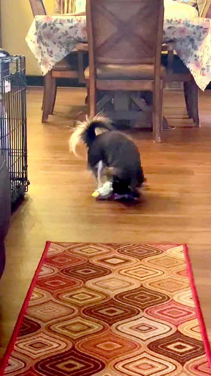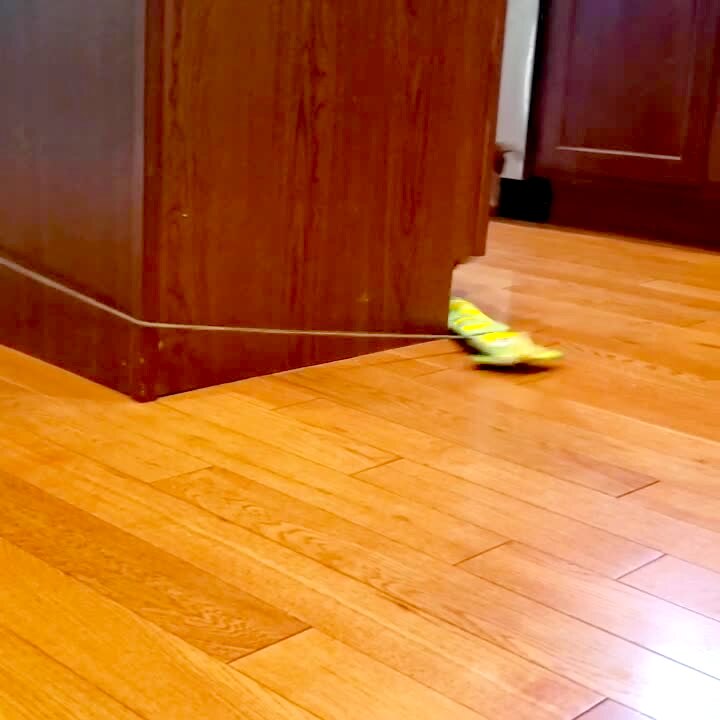 A Bulldog dog chases a toy around a kitchen island and howls, but the toy is tied to a string that is tied to his collar so he can never catch it.